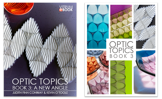 Optic Topics, Book 3: A New Angle, will lead you through 6 chapters, each with multiple palette projects and new, simple methods to add just a hint of Optic pattern to any kiln formed project. Subtle but easy color fades further expand the palette.